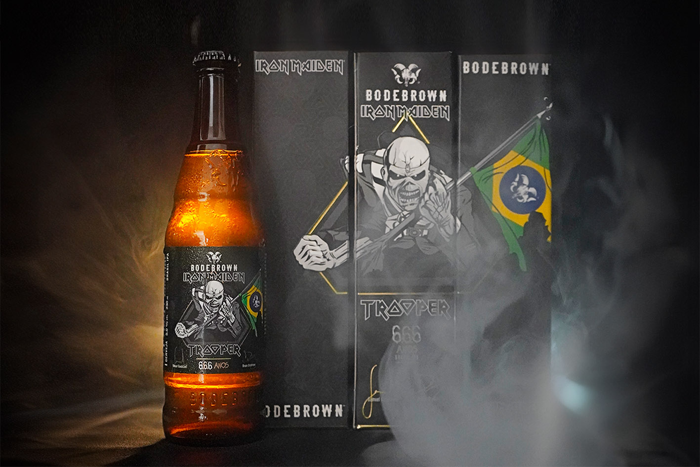 A Trooper Brasil IPA marcou o início da fértil parceria entre a Bodebrown, cervejaria curitibana que está entre as mais premiadas do continente, e o Iron Maiden, maior banda de heavy metal do planeta e grande ícone do rock. Lançada em 2019, ela foi criada como fruto da colaboração direta entre os irmãos Samuel e Paulo Cavalcanti, da Bode, com o vocalista Bruce Dickinson, que além de estrela da música, piloto de avião e campeão de esgrima, é cervejeiro artesanal.